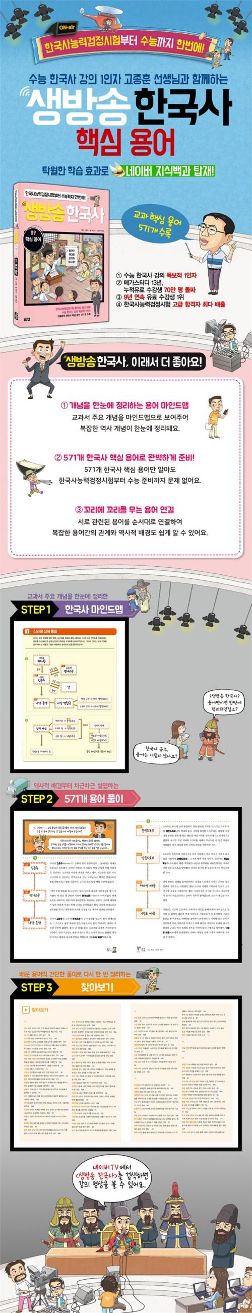 꼬리에 꼬리를 무는 용어 연결! 역사책 옆에 언제나 있어야 할 책이 바로 역사 용어 풀이집입니다. 용어를 알아야 역사를 이해할 수 있으니까요. 하지만 어려운 역사 용어를 또 어려운 표현으로 설명한다면 다 소용 없는 일! 용어 풀이는 얼마나 쉽게! 어린이들의 눈높이에 맞춰 설명하는지가 가장 중요합니다. 거기에 서로 연결된 용어들이 어떤 관계를 맺고 있는지 까지 알아야 비로소 용어를 완벽히 이해했다고 할 수 있죠. 생방송 한국사_핵심 용어 편 은 어린이들의 눈높이에 맞게 쉽고 편안한 말투로 이야기를 들려주듯 용어의 뜻을 풀이해줍니다. 또 서로 관련이 있는 용어들을 꼬리에 꼬리를 무는 방식으로 묶어 쉽게 이해할 수 있도록 도와줍니다. 생방송 한국사_핵심 용어 편 으로 용어 해설 뿐 아니라, 어떤 용어끼리 관련이 있는지, 비슷해 보이는 용어들 사이에 어떤 차이가 있는지 복잡한 용어간의 관계와 역사적 배경까지 확실하게 짚고 넘어가세요.